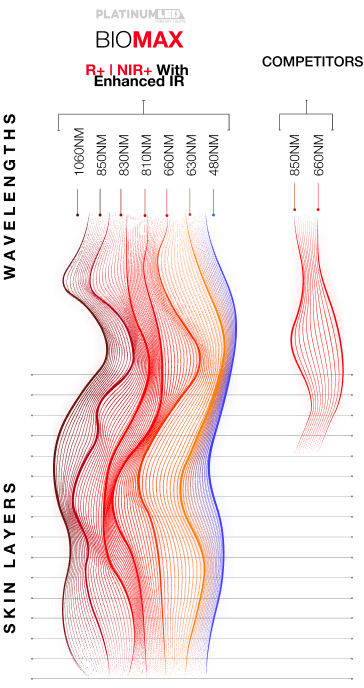 Patent Pending R+|NIR+ Advanced 7 Wave Spectrum: 480nm, 630nm, 660nm, 810nm, 830nm, 1060nm