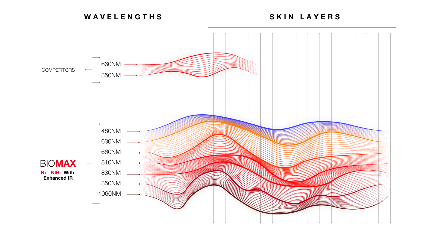 All of our BIOMAX models include our patent-pending R+ | NIR+ spectral output featuring the seven wavelengths of 480nm, 630nm, 660nm, 810nm, 830nm, 850nm and 1060nm. This optimized spectral output closely matches the body’s absorption profile, maximizing ATP production and mitochondrial stimulation within key therapeutic zones.